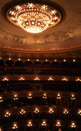 シャンデリアは直径7m、700灯。パリ・オペラ座、ミラノ・スカラ座と並び、世界3大劇場とも呼ばれている。